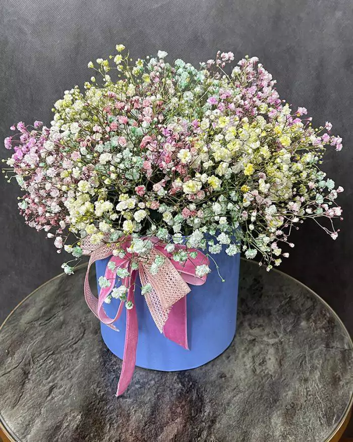 Композиция из разноцветных гипсофил представлена в нежно-голубой коробке.